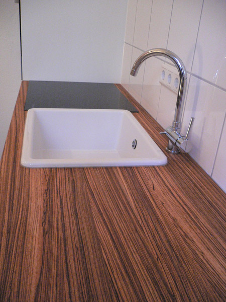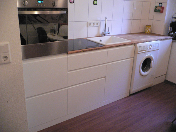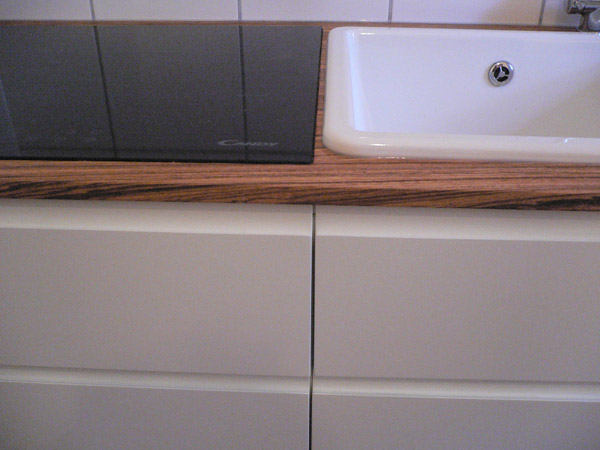 Weiß lackierte fronten mit eingefrästen Griffleiten. Küchenarbeitsplatte aus massivem Zebrano, geölt. Autarkes Kochfeld mit Induktionstechnik und Spülstein im Retro-Look.