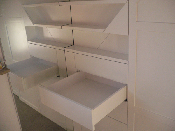 Begehbarer Kleiderschrank in Dachschräge. Schiebetür mit klassischer Rahmen- und Füllungsgestaltung, weiß lackiert. Schubkästen mit griffloser Tip-on Technik.