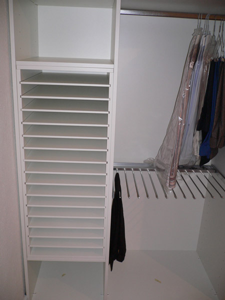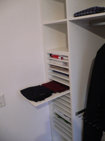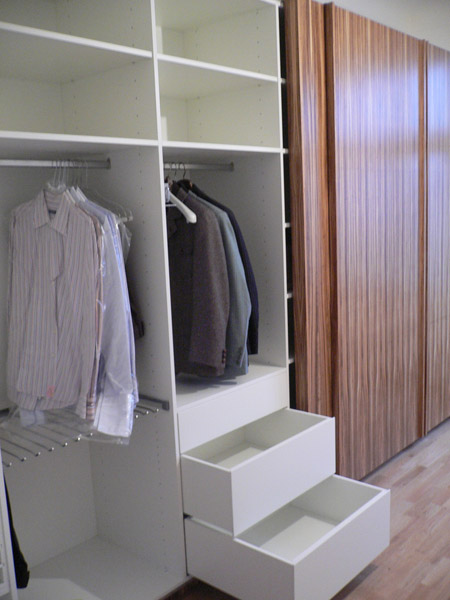 Die Inneneinrichtung des Schrankes erfolgt nun nach Ihren Wünschen. Es gilt eine Auswahl zu treffen unter den angebotenen Beschlägen wie Hosenauszügen, Krawattenauszügen, Haken und Kleiderstangen, Körben, ausziehbaren Böden, Einlegeböden oder gegebenenfalls Liften. Außerdem wird die Anzahl und Position von Schubkästen bestimmt (s. Fotos 5 - 8).
