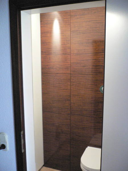 Wandverkleidung in Holzdekor mit hochglanzfinish. Hinter den grifflosen Türen befinden sich Schrankkorpen. WC als Vorsatzmontage an die Verkleidung.
