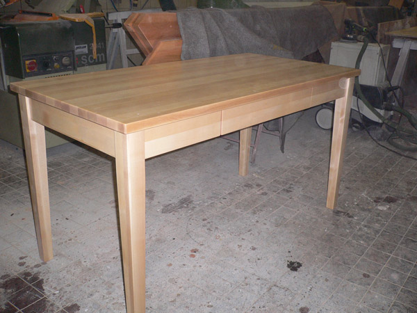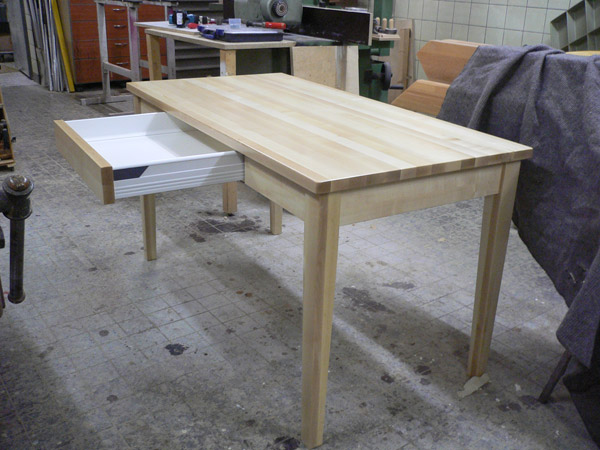 Klassischer Esstisch für die Küche aus massivem Ahorn, klar lackiert. Schubkästen mit Stahlseiten und kugelgelagerten Vollauszügen.