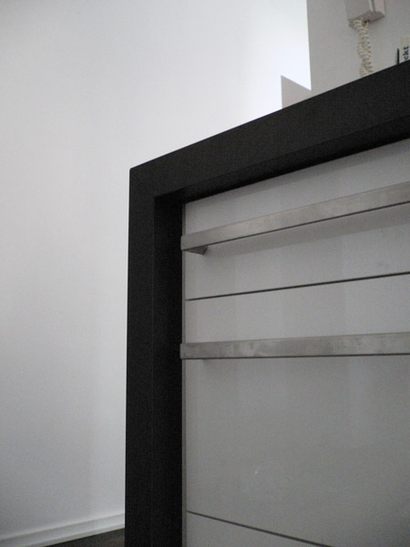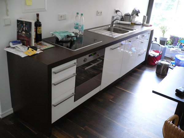 Die Unterschränke und Küchengeräte sind oben und seitlich eingefasst durch eine 70mm dicke HPL-beschichtete Küchenarbeitsplatte in maronbraun. HPL ist ein sehr druck- und kratzfester Schichtstoff der hohen Temperaturen standhält und chemikalienfest ist. Die Oberfläche dieses Schichtstoffes ist in vielen Uni-Farben sowie in glatter Oberfläche lieferbar. Die im Handel üblichen Oberflächenstrukturen von Küchenarbeitsplatten sind hingegen ausschliesslich geperlt.