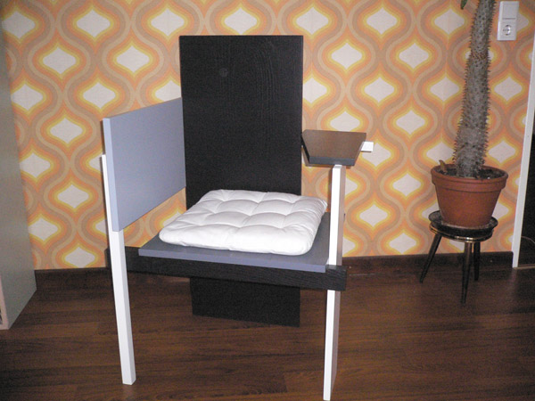Passend zum Desk in Palisander hier der Nachbau eines echten Klassikers; der "Berliner Stuhl" von Gerrit Rietveld. Er wurde aus massivem Eichenholz hergestellt und porig lackiert.