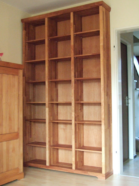 Offenes Bücherregal aus massiver Keilgezinkter Erle, geölt. Sockel und Kranz in klassischer Bauweise.